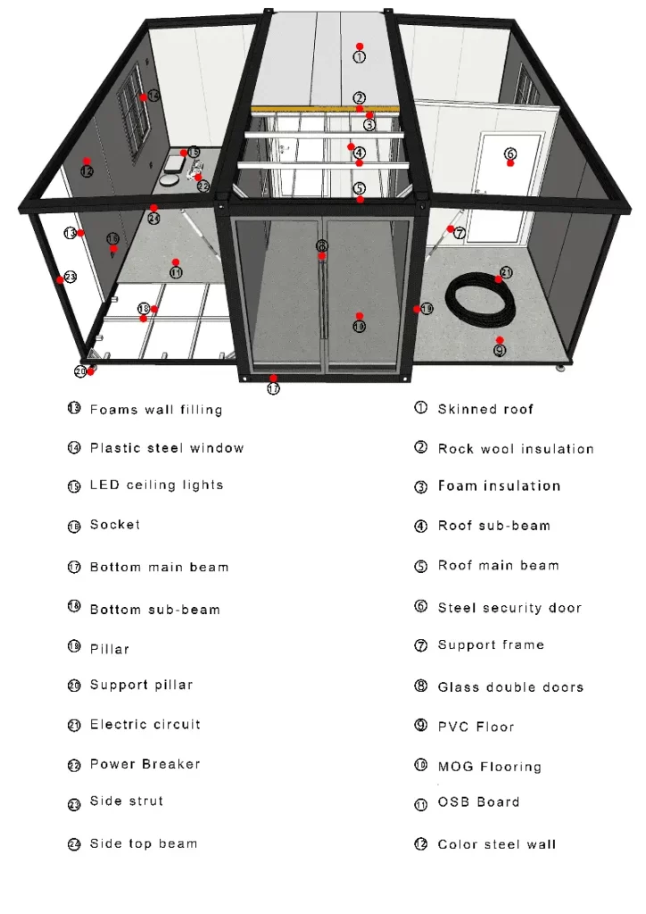 La base de la casa modular expandible es un sólido marco de acero galvanizado, que garantiza una resistencia y durabilidad excepcionales. El marco está diseñado para soportar las dificultades del transporte y el montaje, asegurando una solución de vivienda duradera y confiable.